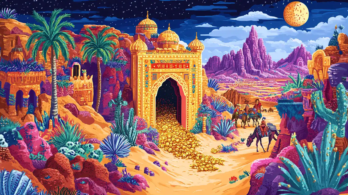 Al otro lado, encontró una cueva oscura y profunda. Decidió entrar con cuidado, llevando consigo una rama encendida que le sirviera de antorcha. A medida que avanzaba, la cueva se iluminaba con un brillo dorado. Para su asombro, Karim se encontró frente a un vasto tesoro: montones de monedas de oro, joyas resplandecientes y objetos preciosos de todo tipo.